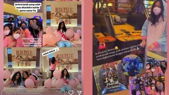 Hal itu juga dialami oleh Tia. Wanita cantik berwajah manis ini juga mendapatkan “hadiah” dari para sahabatnya. Tia mendapatkan sebuah mahkota dan selempang bertuliskan “bride to be” yang artinya “calon pengantin”. Ia mengenakan pakaian dan sepatu. Tia juga dapat kejutan dengan didandani dengan riasan wajah yang aneh.