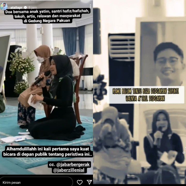 “Anak ini (Eril) anak biasa yang mungkin dia bukan seperti adik-adik semua, hafidz dan Hafidzah, belum sampai kesana. Dia juga mungkin bukan seperti artis-artis, publik figur, bukan siapa-siapa. Tapi begitu banyak doa mengalir deras kepada A Eril,” kata Atalia Praratya dalam video yang beredar di TikTok.