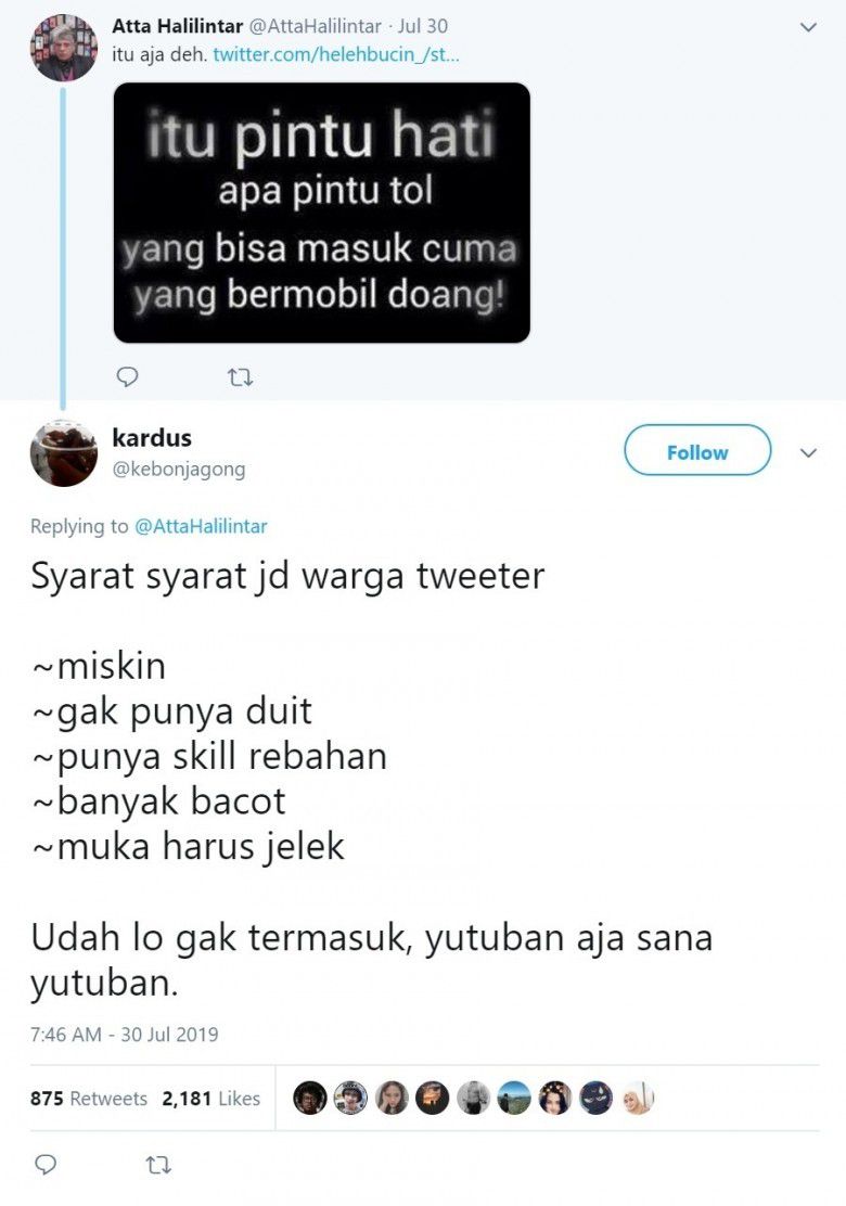 Para netizen ini bahkan membuat Twit yang isinya adalah aturan menjadi warga Twitter. Akun @kebonjagong menuliskan syarat werga Twitter adalah miskin, gak punya duit, punya skill rebahan, banyak bacot, muka harus jelek. Ia merasa Atta tidak cocok dan memintanya kembali ke YouTube saja.