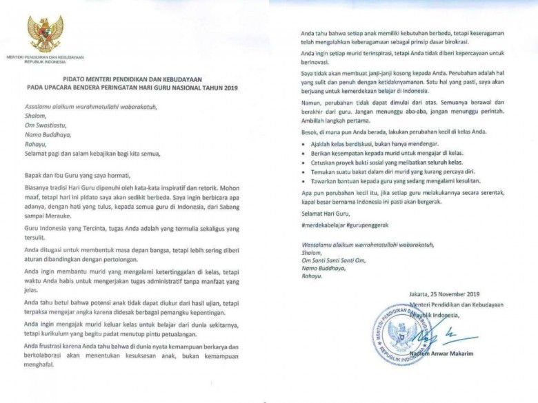 Di akun Twitter @Kemdikbud_RI, terlihat sebuah unggahan berupa foto lembaran pidato Nadiem untuk Hari Guru 2019 ini.