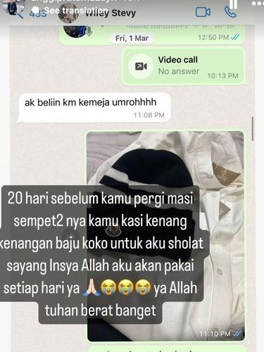 "20 hari sebelum kamu pergi masih sempat-sempatnya kamu kasih kenang-kenangan baju koko untuk aku salat sayang. Insyaallah aku akan pakai setiap hari, ya Allah Tuhan, berat banget," tulis Anggi Pratama seraya membagikan foto baju koko pemberian mendiang Stevie Agnecya.