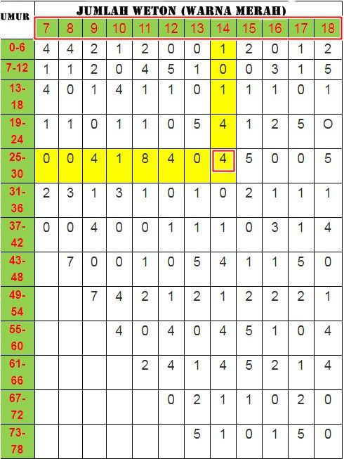 Kalo udah, sekarang kamu sandingkan angka tadi ke usia kamu sekarang. Kalo usia kamu 20 tahun dan wetonnya 8, berarti kamu tinggal cari sendiri deh di tabel gambar berikut ini.