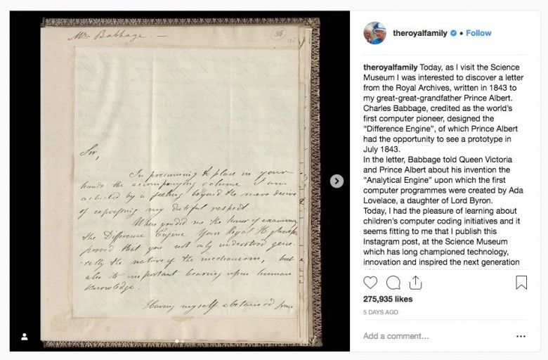 Postinganya diunggah menggunakan akun resmi TheRoyalFamily berupa foto surat yang dikirimkan kepada kakek buyutnya Pangeran Albert dari ahli matematika, insinyur dan perintis komputer abad ke-19 Charles Babbage.