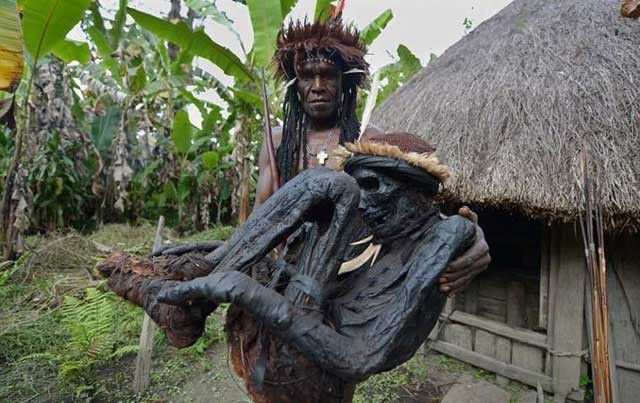 Suku Asmat dari Papua ini melakukan mumifikasi pada mayat layaknya pemakaman mesir kuno. Hanya mereka yang memiliki kedudukan tinggi dalam komunitas suku setempat yang mayatnya dijadikan mumi, contohnya kepala suku. Setelah dibaluri zat pengawet, tubuh jenazah akan ditempatkan di depan perapian yang senang menyala dalam posisi duduk. Panas yang dilepaskan oleh asap mampu membantu tubuh jenazah menjadi semakin awet dan tahan dari proses pembusukan.