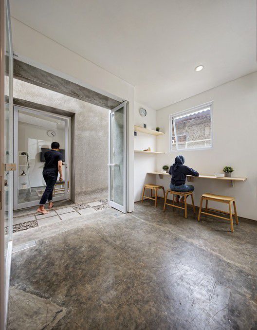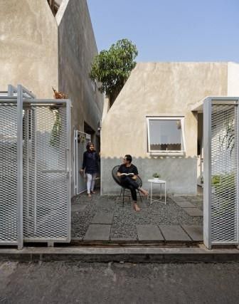 Dua bangunan rumah idaman milenial dibangun dalam sepetak lahan. Ada sebuah pintu kaca yang menghubungkan kedua bangunan rumah kecil itu. Pintu kaca itu juga bisa dibuka untuk membuat ruangan jadi lebih luas.