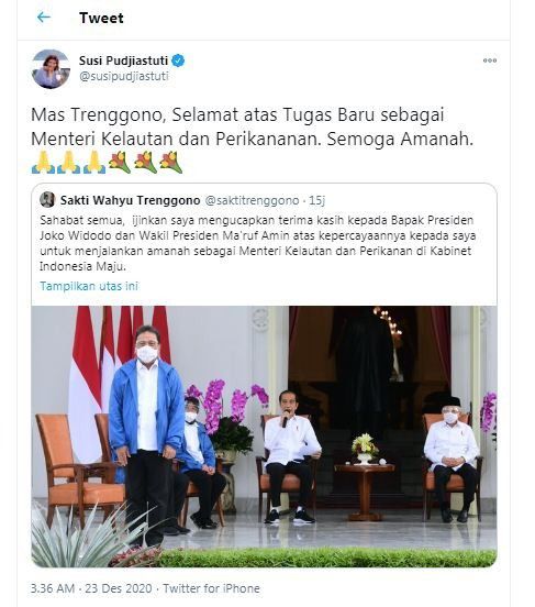"Mas Trenggono, Selamat atas Tugas Baru sebagai Menteri Kelautan dan Perikananan. Semoga Amanah," kata Susi seperti dikutip dari Twitternya, Rabu (23/12).