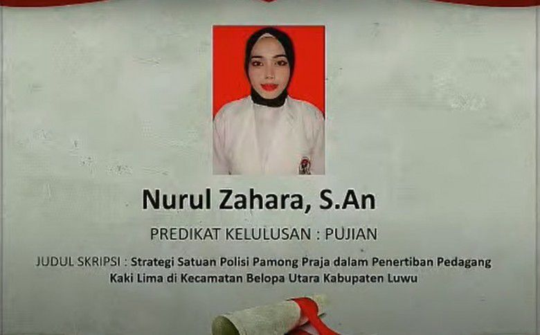 “Skripsinya tentang strategi satuan polisi pamong praja dalam penertiban pedagang kaki lima di Kecamatan Belopa Utara, Kabupaten Luwu,” ujar Darmawati.