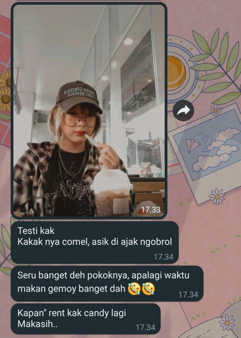 Sementara untuk kencan online dipatok 3 hari Rp 80.000 dan 7 hari Rp 170.000. Untuk layanan tambahan seperti voice note dan selfie dikenakan tarif tambahan Rp 30.000.Jasa sewa pacar ini dinilai sebagai alternatif bagi mereka yang memiliki masalah karena belum memiliki pasangan. Banyak yang menilai jasa sewa pacar sangat berguna untuk sedikit mengatasi kesepian. (Riska Nurul Fatimah)