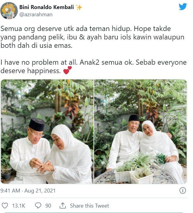 “Saya harap tak ada yang menganggap ini aneh, ibu dan ayah baru saya menikah meski keduanya telah berada di usia senja. Saya tak ada masalah sama sekali. Anak-anak semua oke. Sebab, semua orang kayak berbahagia,” kata Azra.