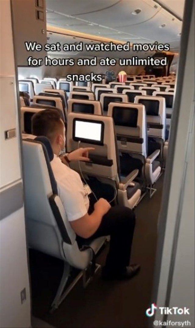 Foto pramugara yang santuy nonton film karena penumpang cuma satu (kumparan.com)