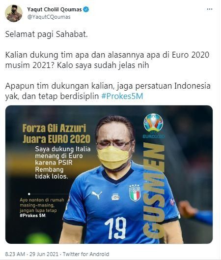 "Selamat pagi Sahabat. Kalian dukung tim apa dan alasannya apa di Euro 2020 musim 2021?," kata Gus Yaqut dilansir dari Twitter, Selasa (29/6/2021).