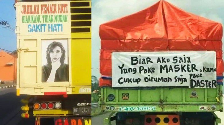 Banyak truk di jalanan memiliki tulisan di bagian belakang. Ternyata tulisan-tulisan yang menarik perhatian itu konon ada hubungannya dengan isi hati si sopir truk sehingga dia memutuskan untuk menuliskan kalimat yang mau dia sampaikan.