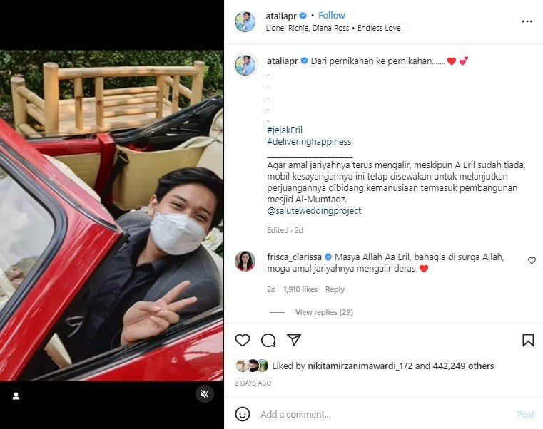 Publik sempat mempertanyakan nasib mobil antik tersebut setelah Eril meninggal dunia. Pertanyaan ini pun dijawab oleh Atalia di bagian caption. Dia mengatakan mobil kesayangan putranya itu akan tetap disewakan. Menurut Atalia Praratya, hal ini bertujuan agar amal jariyah putranya tetap mengalir.