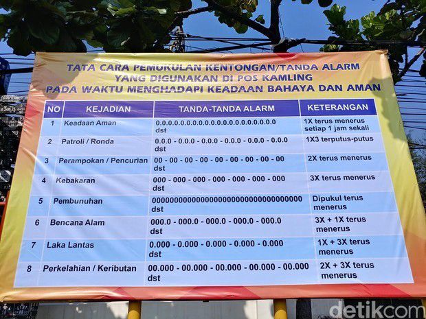 Sementara itu, jika pukulan dua kali putus-putus seperti ‘tong tong, tong tong’, artinya petugas keamanan mengabarkan kalau ada pencurian. Berbeda jika ada kebakaran, kentongan akan diketuk tiga kali secara terus menerus. Untuk kode bencana alam, maka tiang listrik akan dipukul tiga kali ditambah satu kali dengan jeda secara terus menerus.