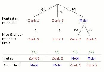 Sebaliknya, kalo kontestan tetep pada pilihan awal, dia akan dapet mobil hanya dalam situasi no 3 atau cuma 1/3 kemungkinannya.
