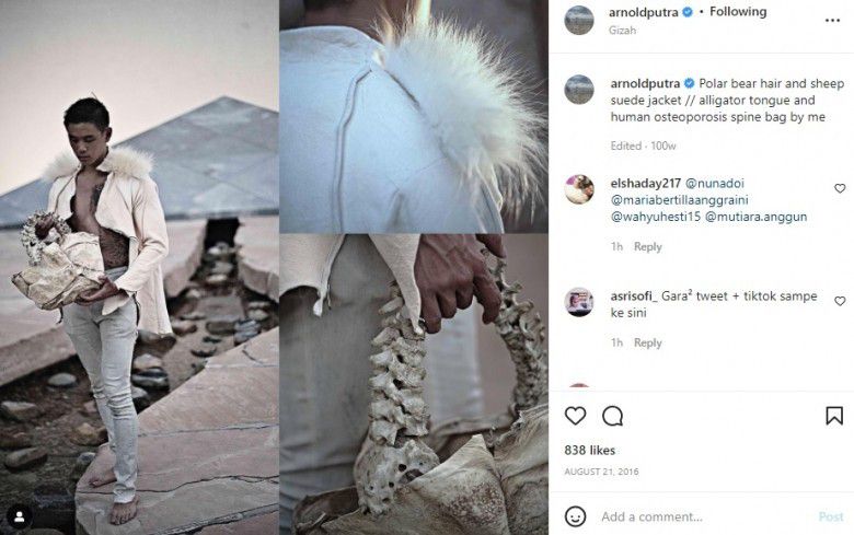 Saat mempromosikan tas tulang belakang karyanya, Arnold Putra juga dengan bangga menerangkan kalau dirinya memakai jaket yang terbuat dari gabungan bulu dengan kulit domba. “Polar bear hair and sheep suede jacket // alligator tongue and human osteoporosis spine bag by me,” tulis Arnold Putra yang diunggah pada 21 Agustus 2016.