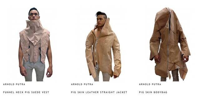 Arnold Putra pernah membuat jaket yang menutupi badan hingga muka yang menyerupai body bag alias kantong mayat. Tiga karya ciptaannya ini berbahan suede dibuat dari kulit babi asli dengan material raw pig skin alias. Untuk rompi dijual dengan harga sekitar Rp11 juta, namun untuk kedua jaket tersebut dapat ditebus dengan uang sekitar Rp44 juta.