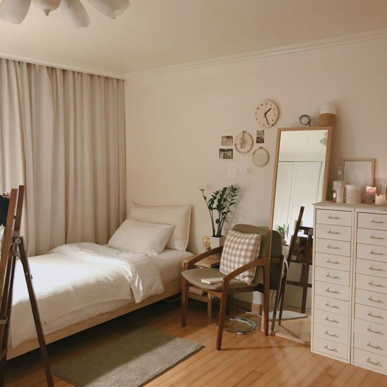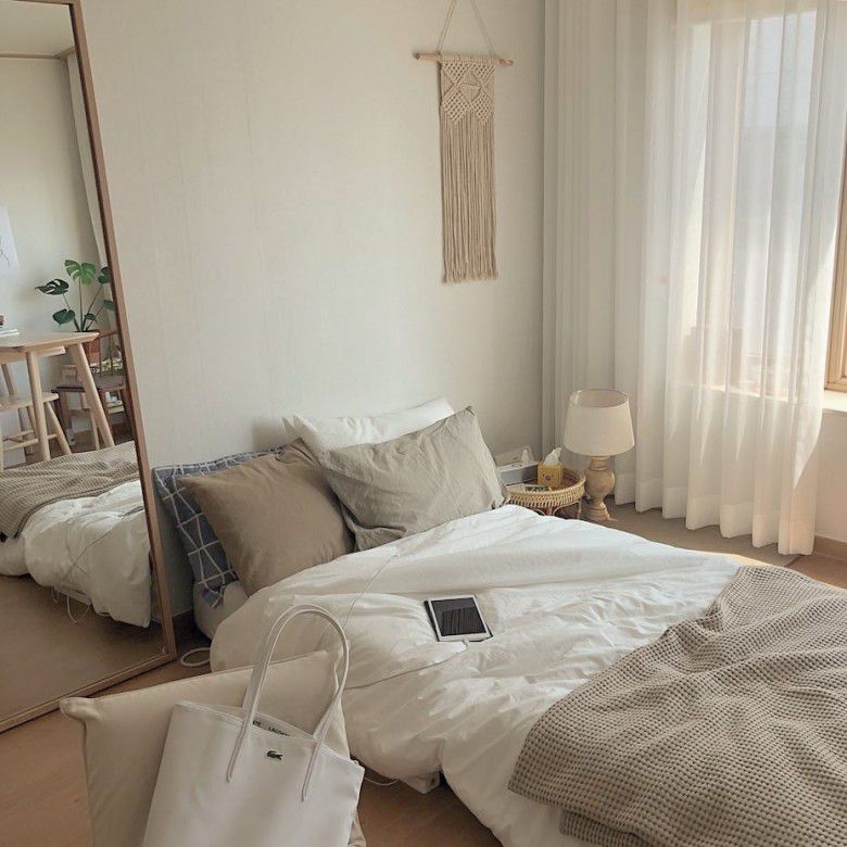 Lebih enak kalo menggunakan single bed. Bisa jadi solusi juga untuk kalian yang memiliki kamar sempit. Selain itu, tambahkan satu cermin tinggi. Hal itu untuk menambahkan kesan lapang dari kamar kalian.