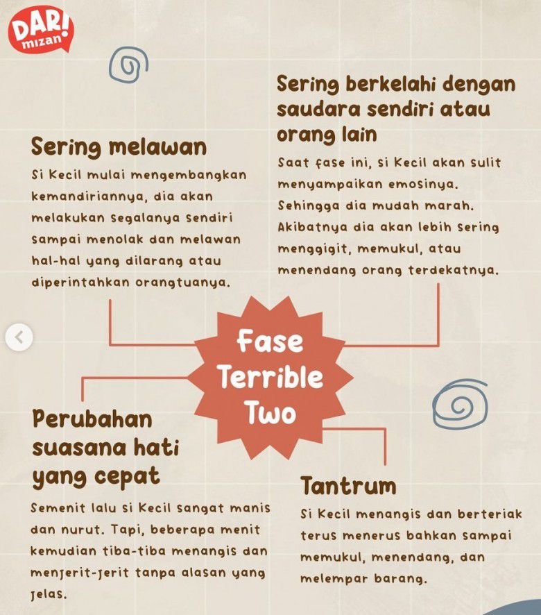 Terrible Two adalah fase anak yang dimulai sekitar usia 2 tahun dan ditandai dengan seringnya marah, perubahan suasana hati yang cepat, dan perilaku impulsif lainnya yang terkadang sulit.