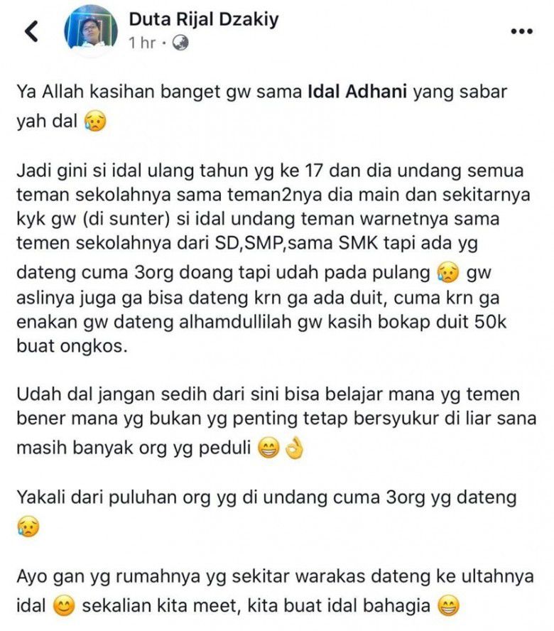 Kisah miris ini dibagikan sama temen Idal yang bernama Duta Rijal Dzakiy di akun Facebook-nya. Sontak postingan ini jadi viral dan dapat komentar netizen. Kebanyakan pada merasa kasihan dan emosi sama temen-temennya Idal. Gak menghargai banget udah diundang.