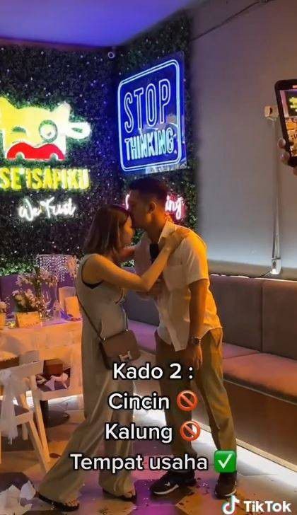 "Kado 2: Cincin (tidak), Kalung (tidak), Tempat usaha (iya)," tulis Tom dalam video TikTok-nya.