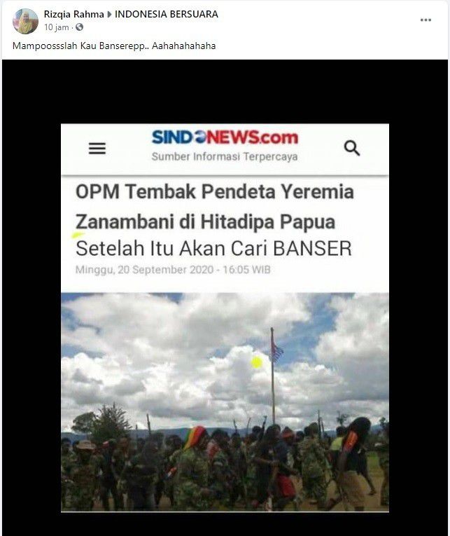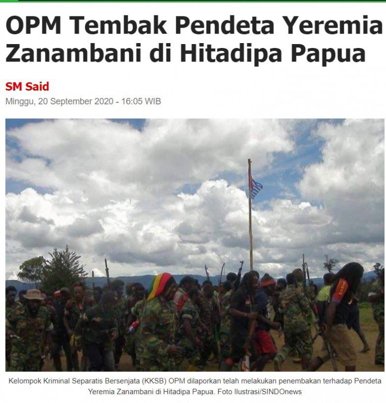 Tangkapan layar artikel berita tersebut mencatut situs online Sindonews.com. Artikel berjudul "OPM Tembak Pendeta Yeremia Zanambani di Hitadipa Papua Setelah Itu Akan Cari BANSER".