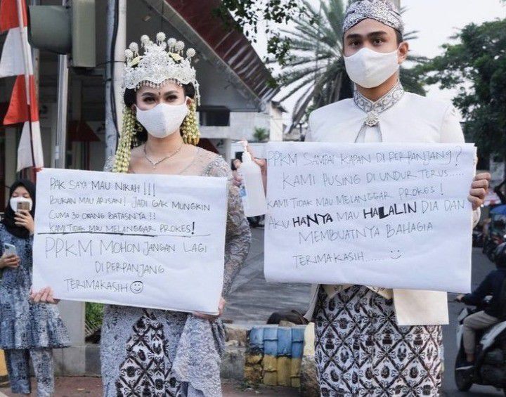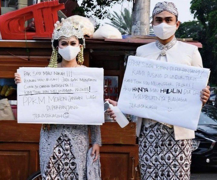 Pasangan yang prewedding di pinggir jalan sembari protes atas PPKM yang diperpanjang (via detik)