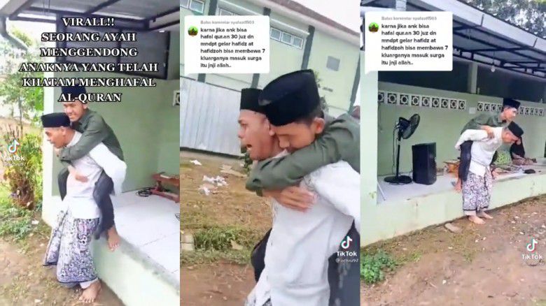 Dalam video yang diunggah akun TikTok @achru97, tampak seorang ayah menangis haru sambil menggendong sang putra yang sudah remaja berlari kecil di sebuah lapangan tanpa alas kaki. Keduanya terlihat mengenakan baju koko dengan bawahan sarung.