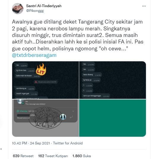 "Awalnya gue ditilang deket Tangerang City sekitar jam 2 pagi, karena nerobos lampu merah. Singkatnya disuruh minggir, terus dimintain surat-surat. Semua masih aktif tuh. Diserahkan lahh ke Si polisi inisial FA ini. Pas gue copot helm, polisinya ngomong 'oh cewek'," bunyi cuitan yang diunggah tersebut.