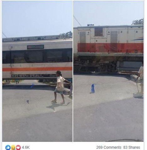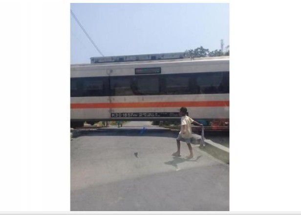 Anak laki-laki menutup perlintasan kereta dengan rafia (Facebook Tri Joko Raharjo)