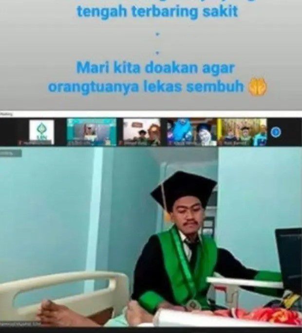 Dalam unggahan itu, terlihat seorang wisudawan mengenakan toga sambil duduk di sebelah seseorang yang sedang terbarik di tempat tidur. Dalam foto itu juga terlihat keterangan bahwa wisudawn itu mengikuti prosesi wisuda online sambil merawat sang ayah yang tengah terbaring sakit karena stroke.