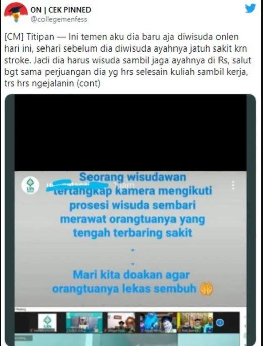 “Ini temen aku dia baru aja diwisuda onlen hari ini, sehari sebelum dia diwisuda ayahnya jatuh sakit karena stroke. Jadi dia harus wisuda sambil jaga ayahnya di RS, salut banget sama perjuangan dia yang harus selesain kuliah sambil kerja, terus harus ngejalanin skripsi di masa pandemik dan dapet cobaan pula di hari bahagianya,” tulis akun Twitter @collegemenfess.