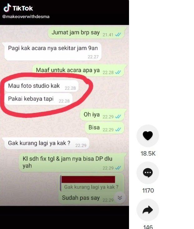 Kisah ini dibagikan melalui akun TikTok @makeoverwithdesma. Dalam video tersebut, terlihat beberapa screenshot percakapan antara MUA dan klien yang menipunya.