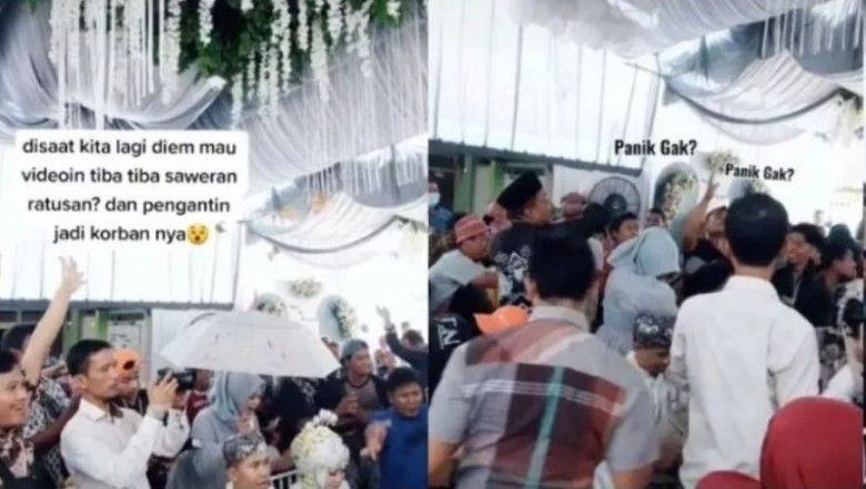"Di saat kita lagi diam mau videoin tiba-tiba saweran ratusan dan pengantin jadi korbannya," tulis akun @nurhayati2222 yang mengunggah video.