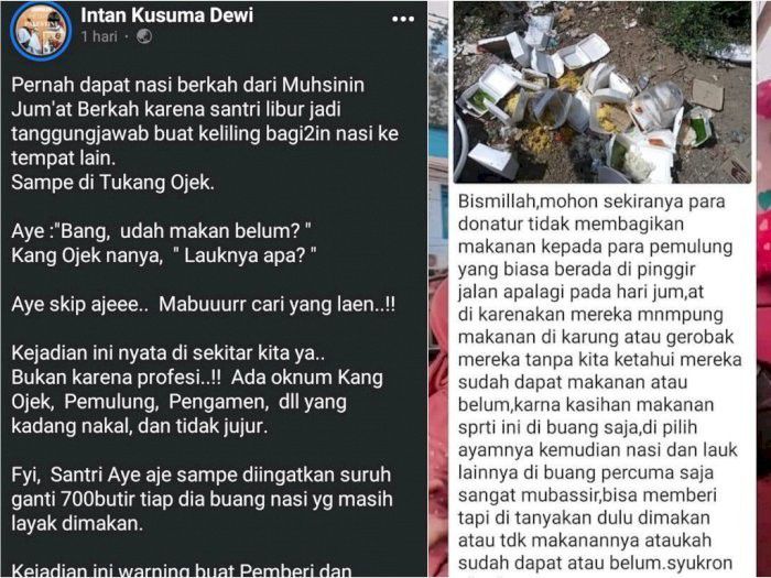 Postingan dari seorang perempuan bernama Intan Kusuma Dewi di Facebook saat ini sedang viral di media sosial. Dalam postingan tersebut pengunggah menceritakan pengalamannya saat diamanahkan untuk berbagi nasi kotak ke daerah sekitar.