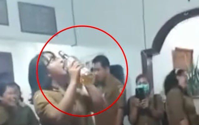 Nampak seorang pegawai wanita memegang botol yang diduga botol minuman keras beralkohol. Ia terlihat seperti mabuk dan nampak santai saat semua orang menyaksikan aksinya. Bahkan wanita itu naik ke atas kursi sembari berjoget.