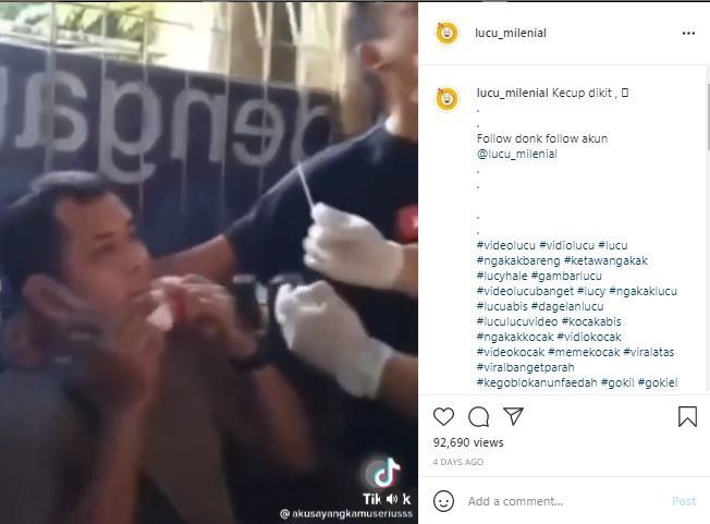 Awalnya, video berdurasi 7 detik itu memperlihatkan pria yang hendak dites sedang bersiap untuk menerima colokan alat swab test pada Sabtu, (3/7/2021).