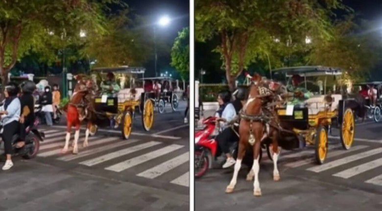 Ternyata, hal ini terjadi karena pak kusir yang reflek menarik tali di tubuh kuda usai adanya emak-emak naik motor yang mengerem mendadak di depannya.