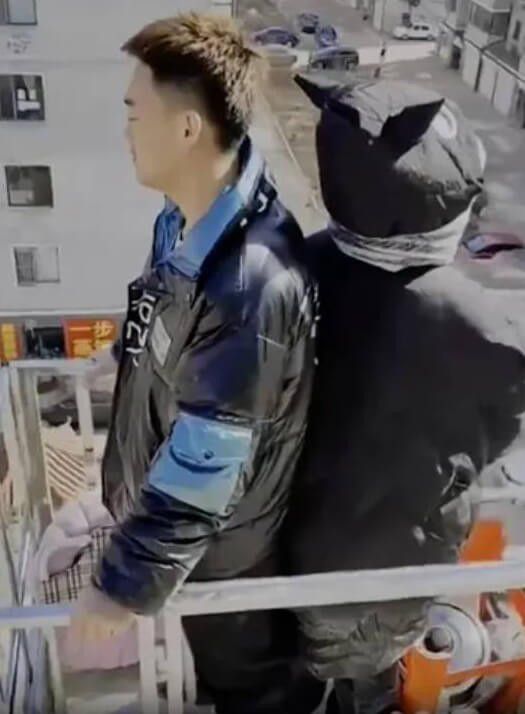 Dari video unggahan Wang di Douyin (media sosial seperti TikTok, tampak seorang pekerja derek menemani wanita muda naik ke balkon rumahnya.