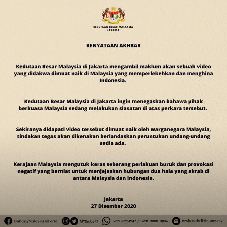"Kedutaan Besar Malaysia di Jakarta telah memperhatikan video yang telah menghina Indonesia. Dimana video tersebut diklaim telah diunggah dari Malaysia," tulis pernyataan resmi Kedubes Malaysia dalam akun Facebook-nya sebagaimana dilihat, Minggu (27/12/2020) malam.