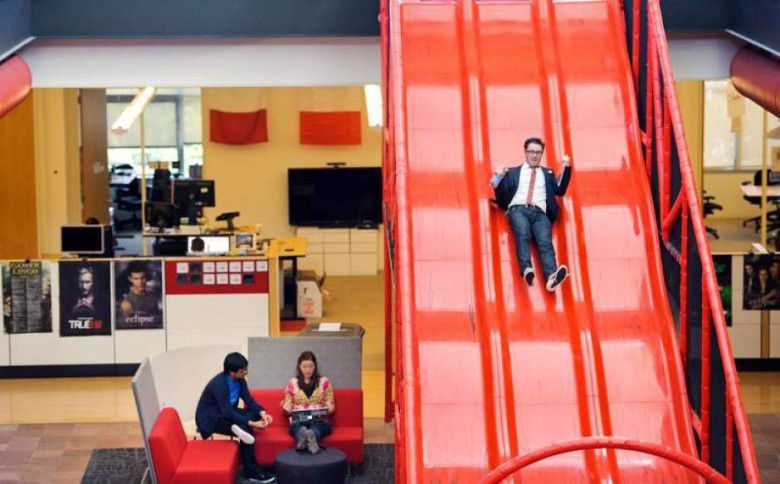 23. Para karyawan di markas YouTube yang terletak di San Bruno, California, bisa memilih untuk naik elevator, eskalator, atau perosotan besar. Hepi banget pasti ya kerja di sana.