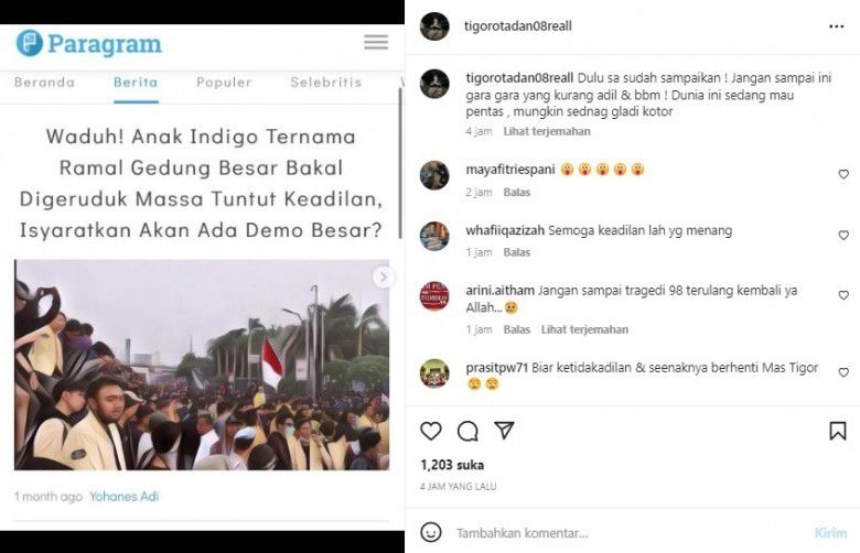 “Dulu sa sudah sampaikan! Jangan sampai ini gara gara yang kurang adil & BBM! Dunia ini sedang mau pentas, mungkin sedang gladi kotor,” ungkap Tigor Otadan di bagian caption postingannya tersebut.