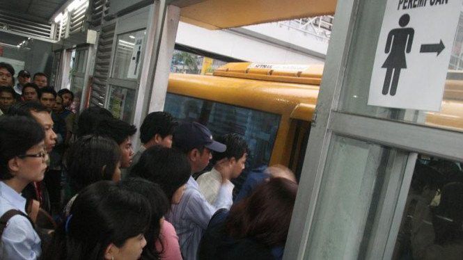 Padatnya pintu masuk bus trans Jakarta (viva.co.id)
