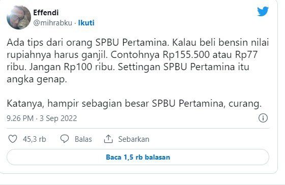 Warganet tersebut bernama Effendy yang memiliki akun Twitter @mihrabku. Melalui cuitannya ia mendapatkan bisikan dari salah satu orang yang bekerja di SPBU agar pelanggan tidak kena tipu operator SPBU. “Ada tips dari orang SPBU Pertamina. Kalu beli bensin nilai rupiahnya harus ganjil,” cuitnya.