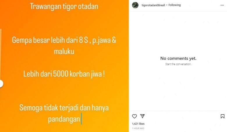 “Trawangan Tigor Otadan. Gempa besar lebih dari 8S, P. Jawa & Maluku. Lebih dari 5.000 korban jiwa!,” tulis Tigor dalam unggahannya dengan latar polos berwarna orange.