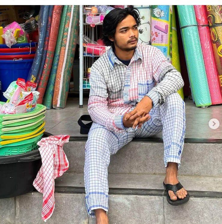 Terlihat dirinya menggunakan kain lap motif kotak berwarna biru, merah dan hitam yang umumnya di jual di pasaran. Lalu, ia pun menggabungkan beberapa kain lap yang kemudian diubah menjadi kemeja dan celana.