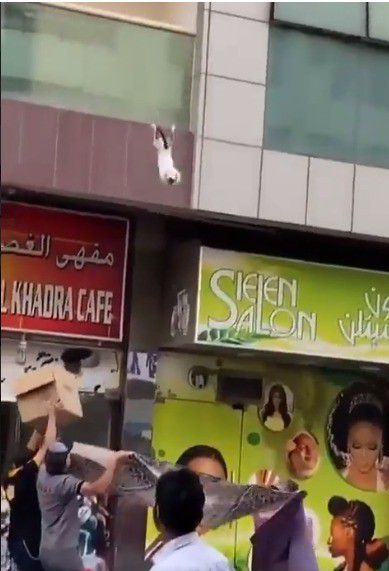 Lalu tak lama, tibalah 3 orang pria yang bergegas mengambil posisi di bawah sambil membentangkan kain seperti seprai untuk menangkap si kucing. Beberapa orang di sekitarnya pun ikut menyaksikan peristiwa penyelamatan kucing tersebut.
