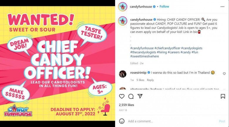 Perusahaan itu bernama Candy Funhouse asal Kanada. Mereka membuka lowongan untuk posisi pencicip permen. Dilansir dari Washingtonpost, posisi lowongan kerja yang diberi nama Chief Candy Officer (CCO) ini dibagikan melalui LinkedIn dan juga Instagramnya.