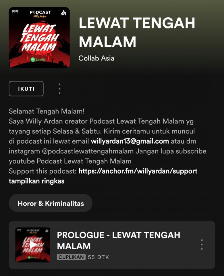 Podcast horor yang juga sangat popular di Spotify adalah Podcast Lewat Tengah Malam. Sama seperti podcast lainnya, podcast ini menyuguhkan kisah nyata dari para pengirim cerita. Kisah yang dibacakan juga beragam mulai dari urban legend, thread horor, kriminal sampai true story dan pastinya bisa membuat pendengarnya merinding.
