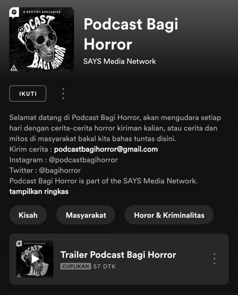 Podcast dari SAYS Media Network ini juga menjadi salah satu rekomendasi podcast horor Spotify terbaik karena kerap masuk dalam jajaran top podcast kategori horor. Podcast yang mengudara setiap hari ini juga memperbolehkan pendengar mengirim pengalaman menyeramkan atau cerita mitos yang beredar di masyarakat. Podcast Bagi Horor juga menerima cerita horor dalam format audio. Sebelum disiarkan, cerita horor akan diseleksi terlebih dahulu. Tidak hanya cerita dari orang lain, Pradipta Arga selaku host Podcast Bagi Horor juga akan menceritakan soal legenda horor. Cerita ini akan dilengkapi dengan suara latar yang menegangkan dan menyeramkan yang tentunya membuat pendengarnya terngiang-ngiang.
